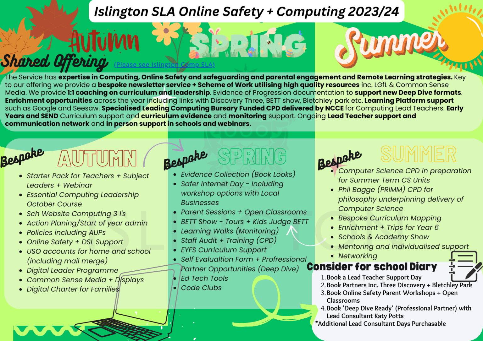 Islington Computing SLA offer a wide range of ongoing and CPD for our community. Take a look at the bespoke training and support we offer on the leaflet below.